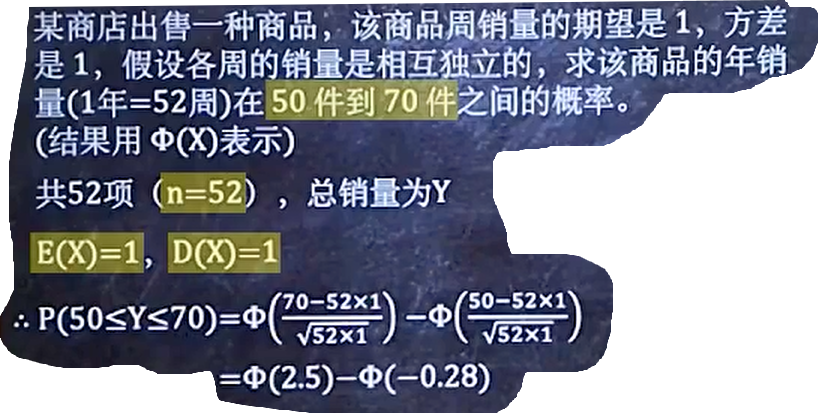 梗概: 对于该分布的随机变量, 同时满足以下两个条件 该随机变量由n个随机变量相加而成, 一个随机变量称为一项 对于每一项随机变量, 其样本数学期望和方差都相同, 称为同分布 性质: 该分布从结果来看, 符合正态分布 其参数为: μ=nE(X), α²=nD(X) 这里的E(X)和D(X)都是针对单项随机变量而言的 例题: