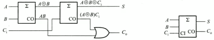 梗概: 有三部分输入: 两个二进制数, 一个来自低位的进位信号 两部分输出: 一个结果二进制数, 一个输出给高位的进位信号 全加器可以由两个半加器组合而成 图解: S=A⊕B⊕Ci Co=(A⊕B)Ci+AB⭐