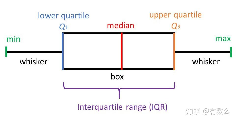 • 胡须Whiskers:框外的两条线扩展到最小值和最大值(通常在1.5xIQR范围内,即非离群点的,Q1-1.5 x IQR, Q3+1.5 x IQR)