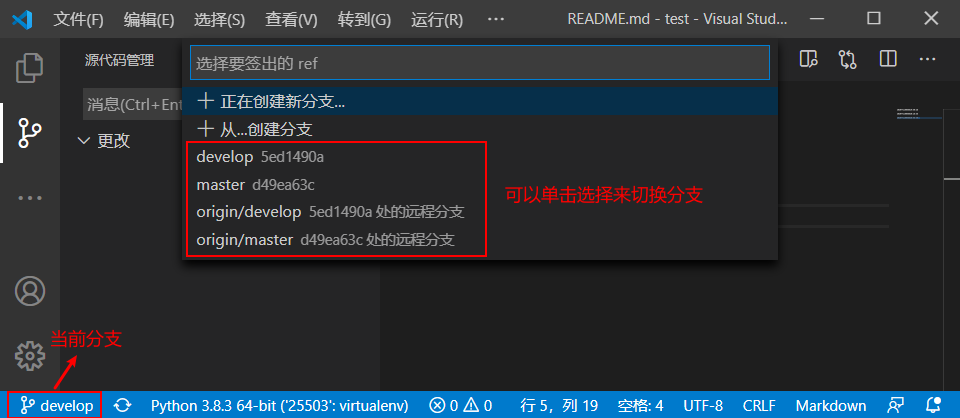 VScode可以直接在左下角创建/切换分支