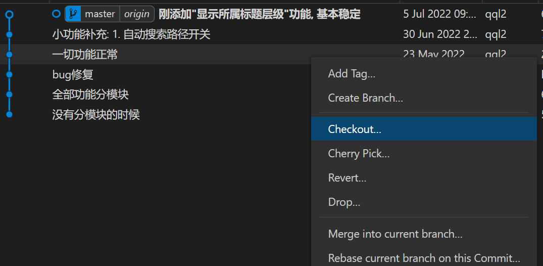 以Git Graph插件为例 Chekout会旧版本的时候, 新版本的commit不会消失, 仍然可以随时回到最新版本 注意: 不建议用该功能把代码全部回滚到很早之前的版本, 会产生很多不可控的问题 如果想要找回很久之前的版本中的某些信息, 建议直接查看文件历史, 然后手动复制粘贴