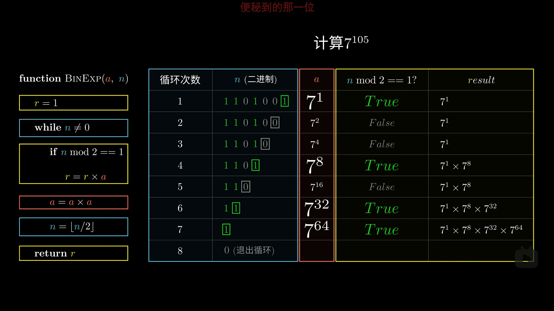 function BINEXP(a, n) r = 1 //初始化 while n!=0 if n & 1 == 1 //取遍历数2^n二进制最后一位判断。&为按位与运算。 r = r * a //乘上所有拆分项计算结果 a = a * a //配合n的遍历次数来计算a^(2^n) n = n>>1//遍历2的2到n次方 return r