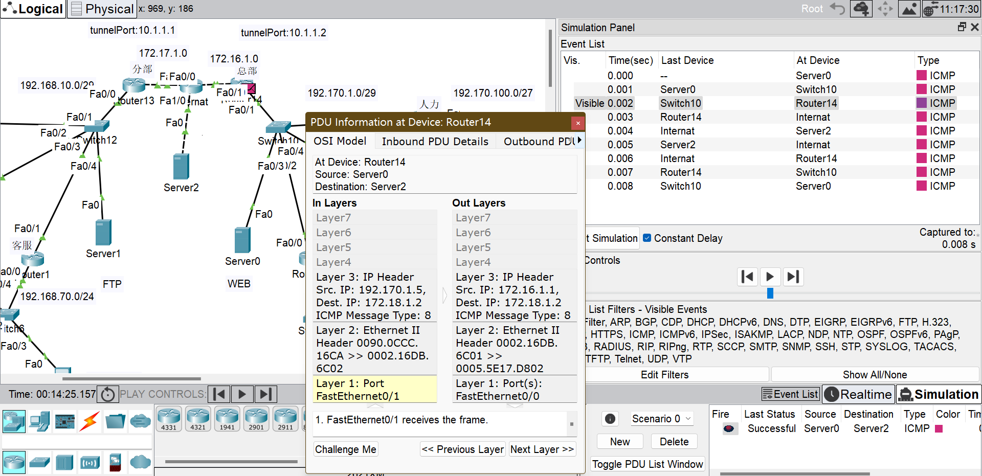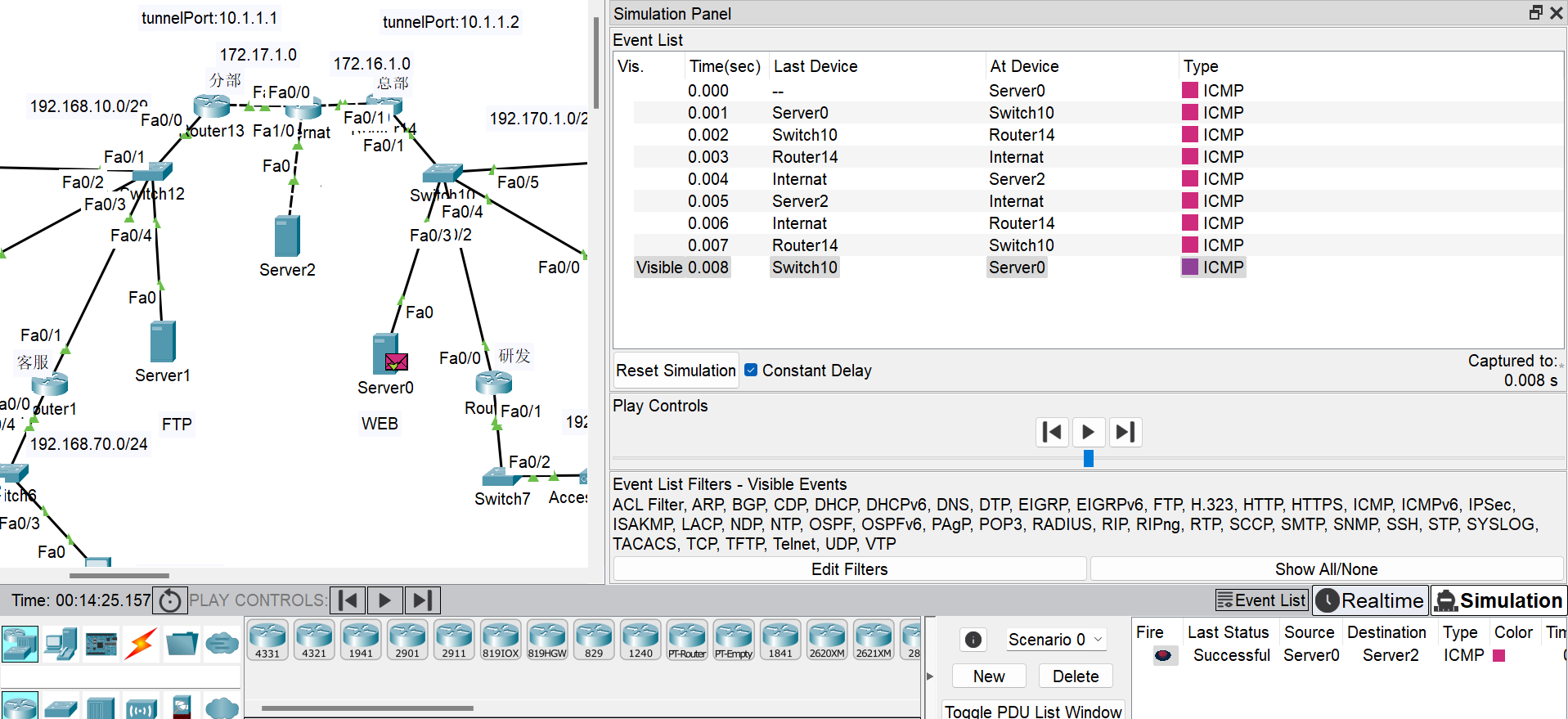 所有机器能上互联网;分部和总部网络资源共享;出差人员可以访问公司局域网的资源;部门处于不同网段;总部搭建 WEB 服务器,提供企业域名访问服务;分部搭建 FTP 服务器,提供文件服务;部门内部使用虚拟 IP 地址,部门之间和外部使用全球唯一地址,地址的分配使用 CIDR 方式;配置上网行为管理;配置无线 AP 和集中控制器;配置访问控制列表;总部配置静态路由分部的客服部有市场部人员(配置 VLAN);机器重启所有配置有效。备注:网络拓扑结构的设计统一使用 Cisco Packet Tracer 模拟器,下文中简称模拟器