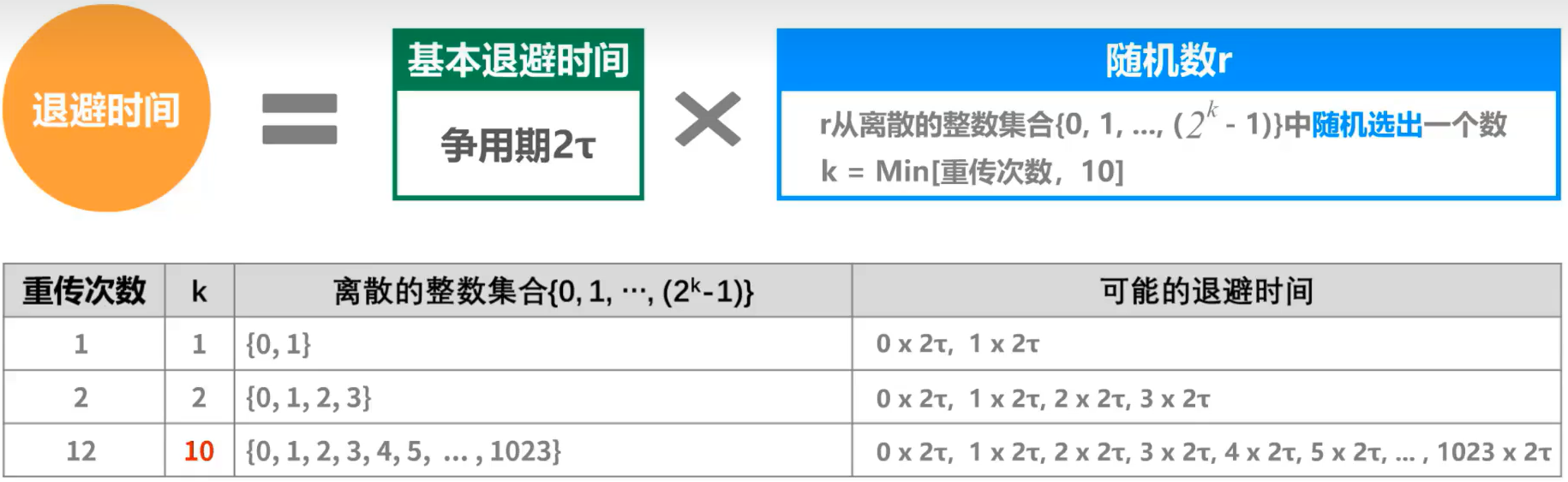 退避-避退 设备停止中断发送后, 随机延迟一小段时间后再次发送数据, 称为退避重发 退避算法 1. 截断二进制指数退避算法 退避时间 = 争用期 ×随机数r 随机数r从整数集合中随机取一个数 整数集合的范围∝重传次数: {0,1,2,…, 2重传次数−1} 1.1. 实例: