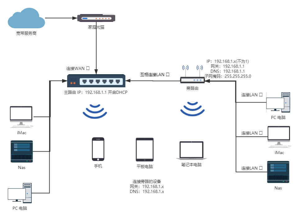 旁路由-旁路网关 梗概 旁路由其实严格意义是指旁路网关 旁路由就是在主路由的网段内再添加的一个路由器 适用范围 作用: 其作用相当于一个交换机, 让部分设备的流量都需要经过这个旁路由 场景 让旁路由处理局域网中的部分流量,减轻主路由的软件负担 拓扑结构 详解 从听说到上手,人人都能看懂的旁路由入门指南 - 少数派