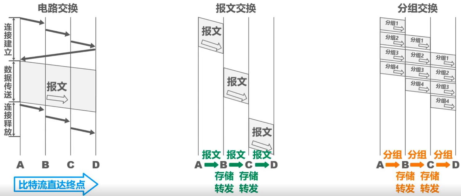 • 电路交换:端对端通信质量因约定了通信资源获得可靠保障,对连续传送大量数据效率高。