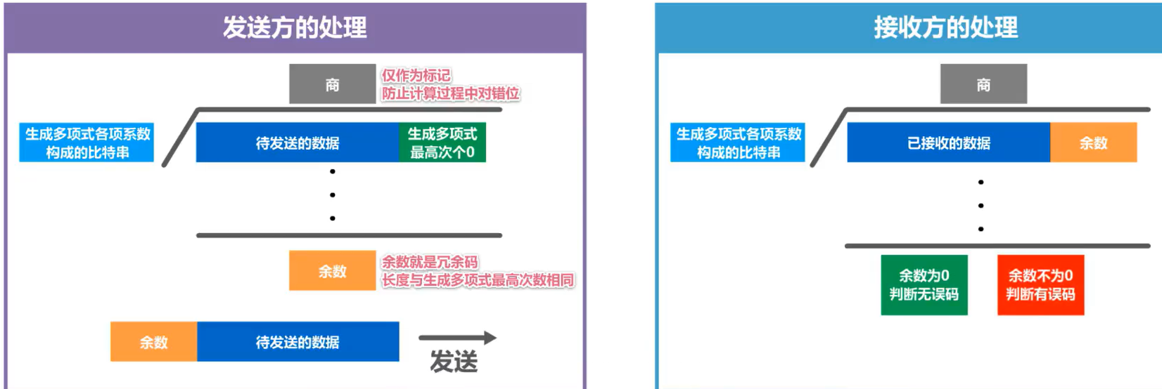 梗概: 双方约定好一个多项式, 称为生成多项式 发送发根据多项式与原始数据, 计算出冗余码, 并将冗余码追加到原始数据后面, 一起发送出去 接收方用接受到的全部数据除以多项式, 检测是否有余数, 有就是出错了 这里说的除法都是指模2除法 1. 图解 实例: 1. 视频讲解 3.3 差错检测_哔哩哔哩_bilibili
