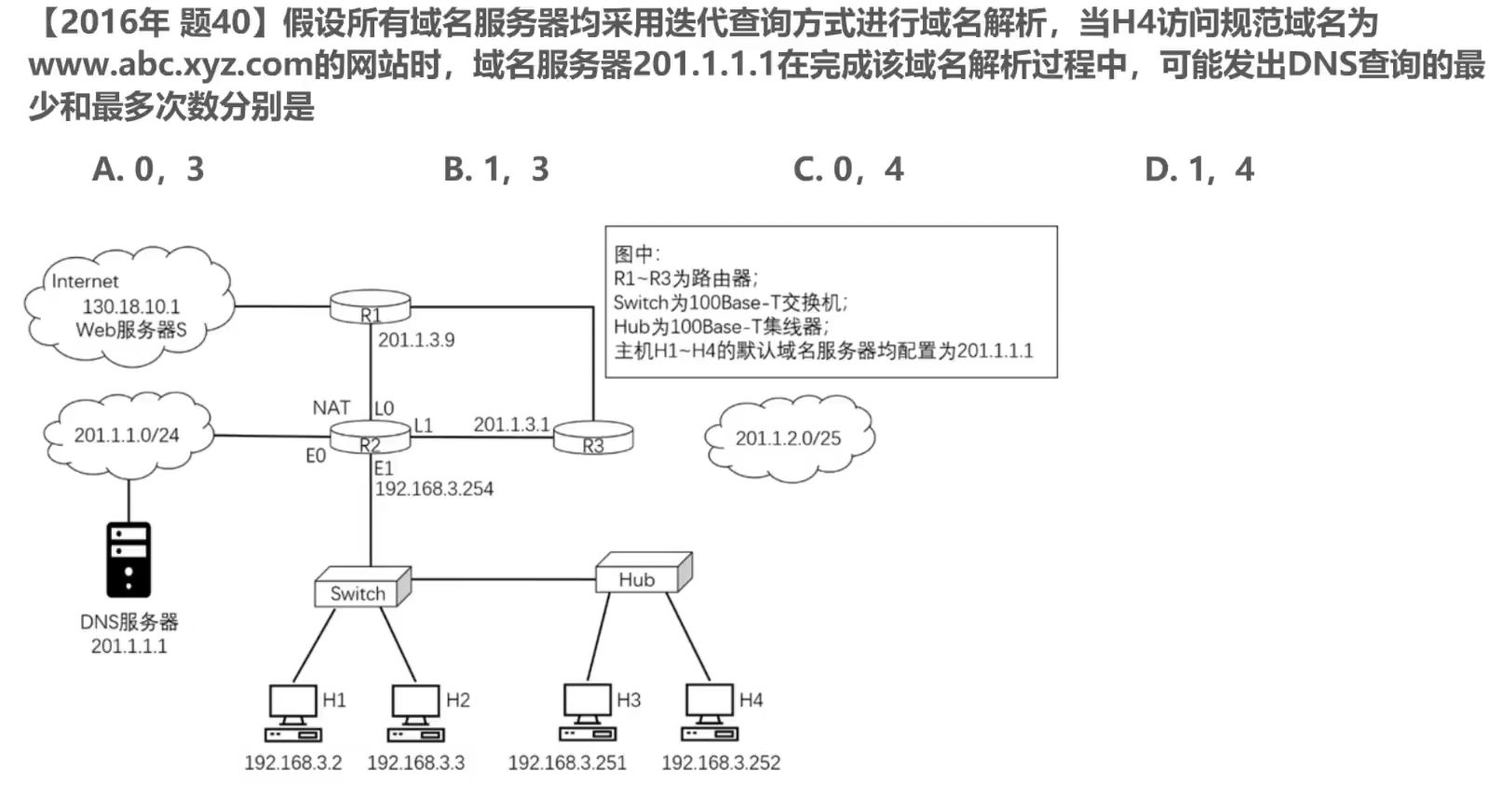 • 题目给定采用迭代查询进行域名解析,在最坏的情况下,需要图中的本地域名服务器依次向以下域名服务器发出共4次DNS查询: