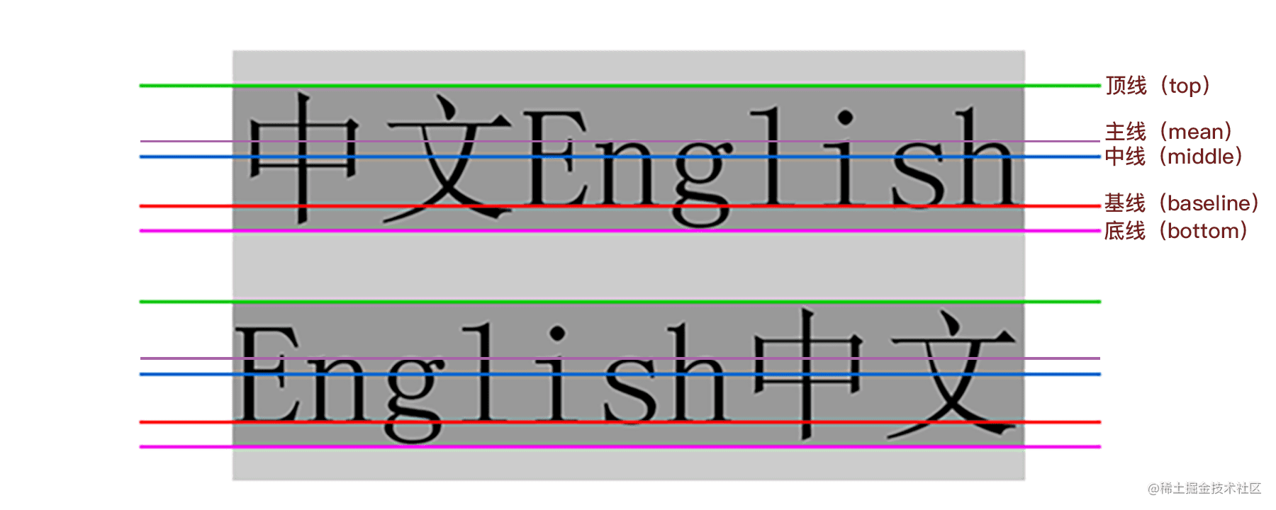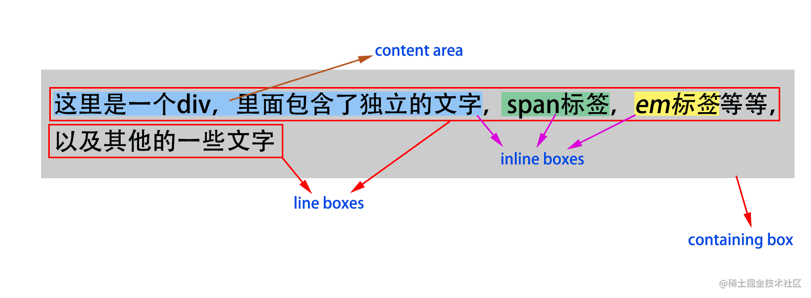 CSS 梗概: 一个抽象出来的范围, 包含整行的inline-box 即块级标签内的每一行都对应一个line-box,每个line-box里面装着若干个inline-box 高度通常是整行inline-box中的最低点到最高点之间的距离 line-box里面还具体等比例分成若干个区域 图解: