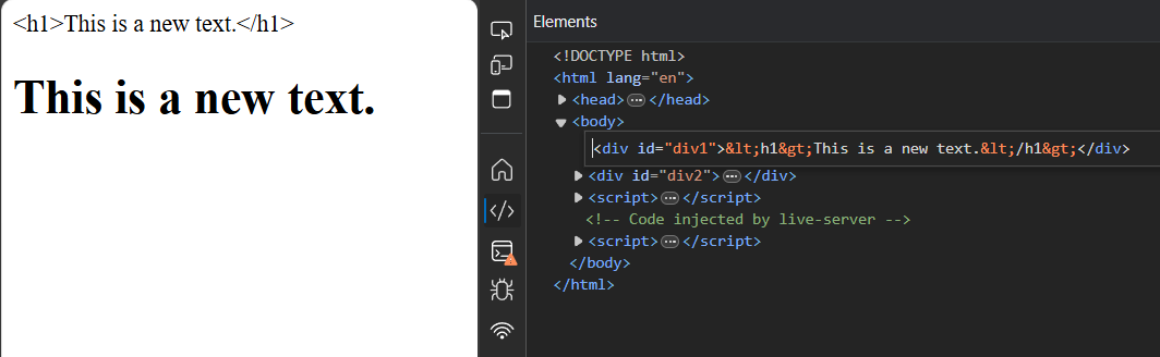 <!DOCTYPE html><html lang="en"> <head> <meta charset="UTF-8" /> <meta name="viewport" content="width=device-width, initial-scale=1.0" /> <title>Document</title> </head> <body> <div id="div1">This is a div element.</div> <div id="div2">This is another div element.</div> <script> var div1 = document.getElementById("div1"); div1.innerText = "<h1>This is a new text.</h1>"; var div2 = document.getElementById("div2"); div2.innerHTML = "<h1>This is a new text.</h1>"; </script> </body></html>