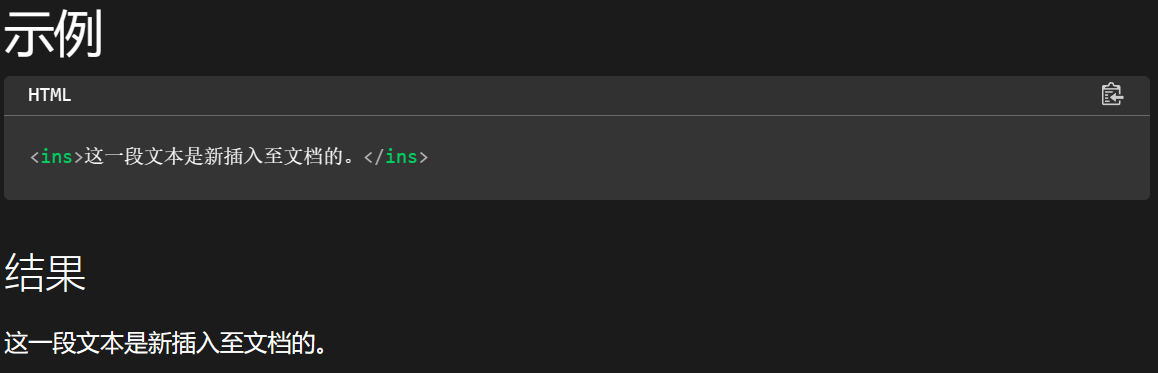 没有特别的显示效果,仅仅用来表示这是一段插入的文本