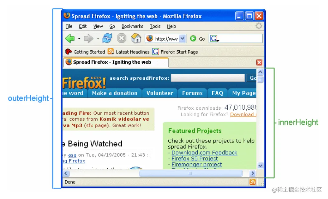 • 是整个浏览器窗口的大小,包括窗口标题、工具栏、状态栏等